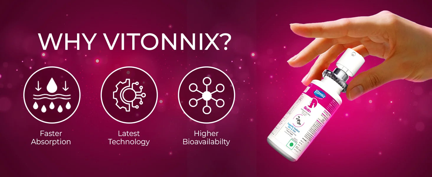 Vitonnix Biotin Sublingual Spray is your single solution to the three fold problem of: hair thinning, brittle nails and dull skin. To get rid of these buy a biotin supplement; Vitonnix Biotin.