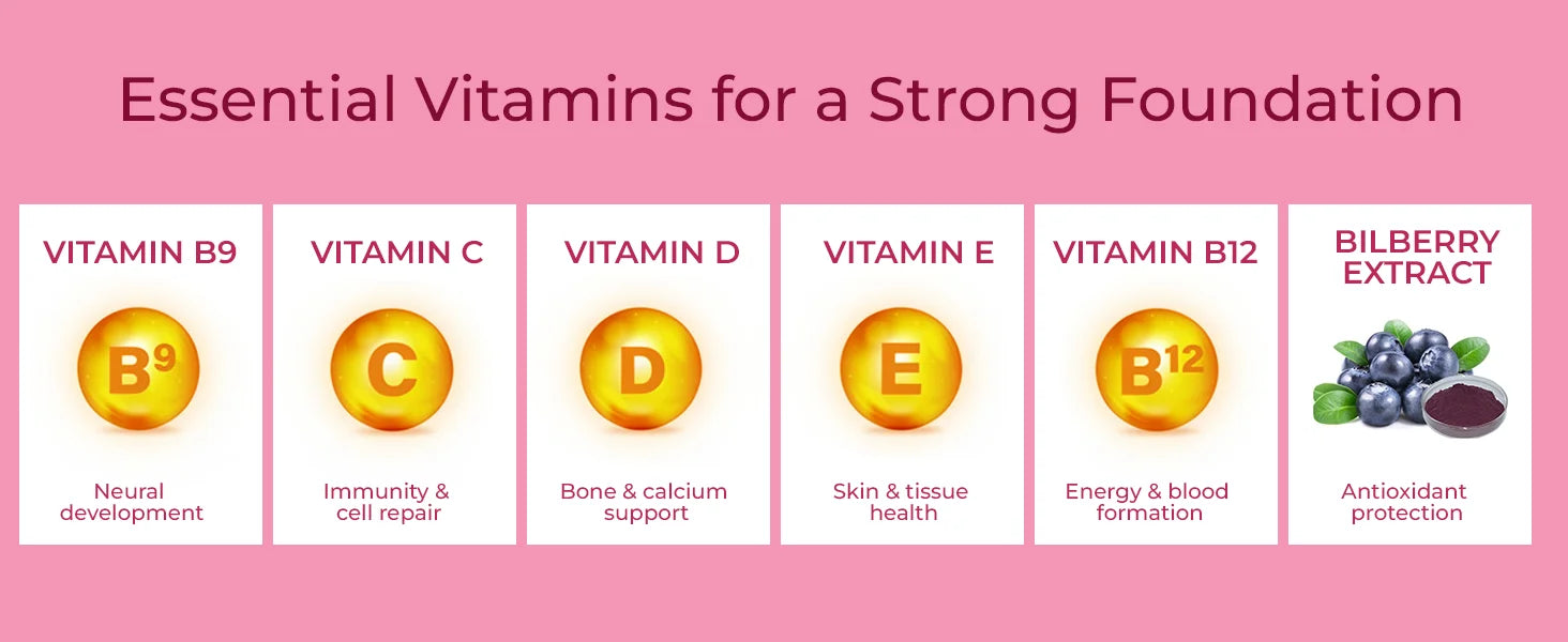 • Safe & Vegetarian Formula: Made with pregnancy-friendly ingredients including Vitamin D2, Vitamin E, Bilberry, Beet Root extracts and essential nutrients like B12 and Iron vitamin supplement, it supports bone health, cell protection, and better circulation.